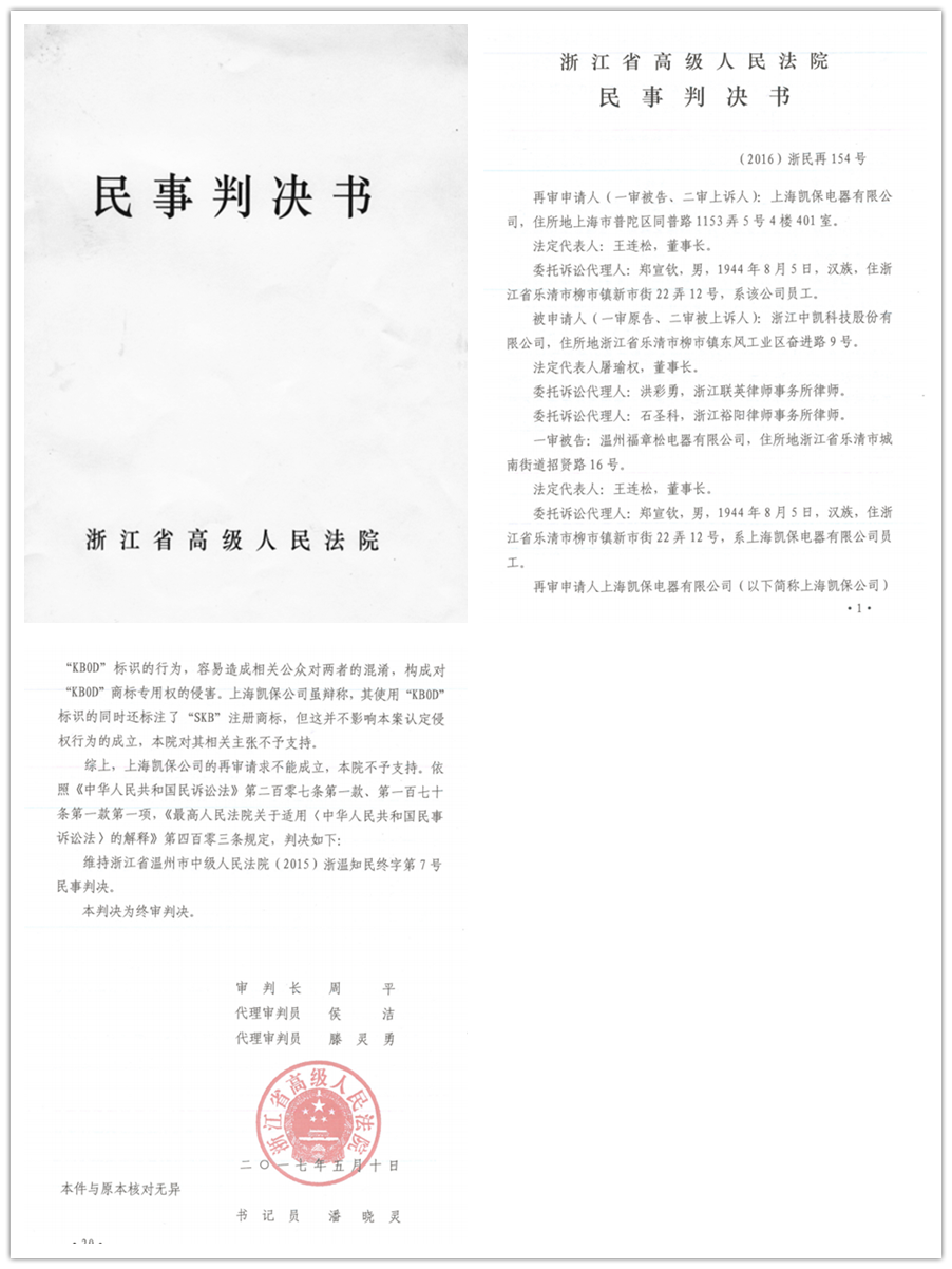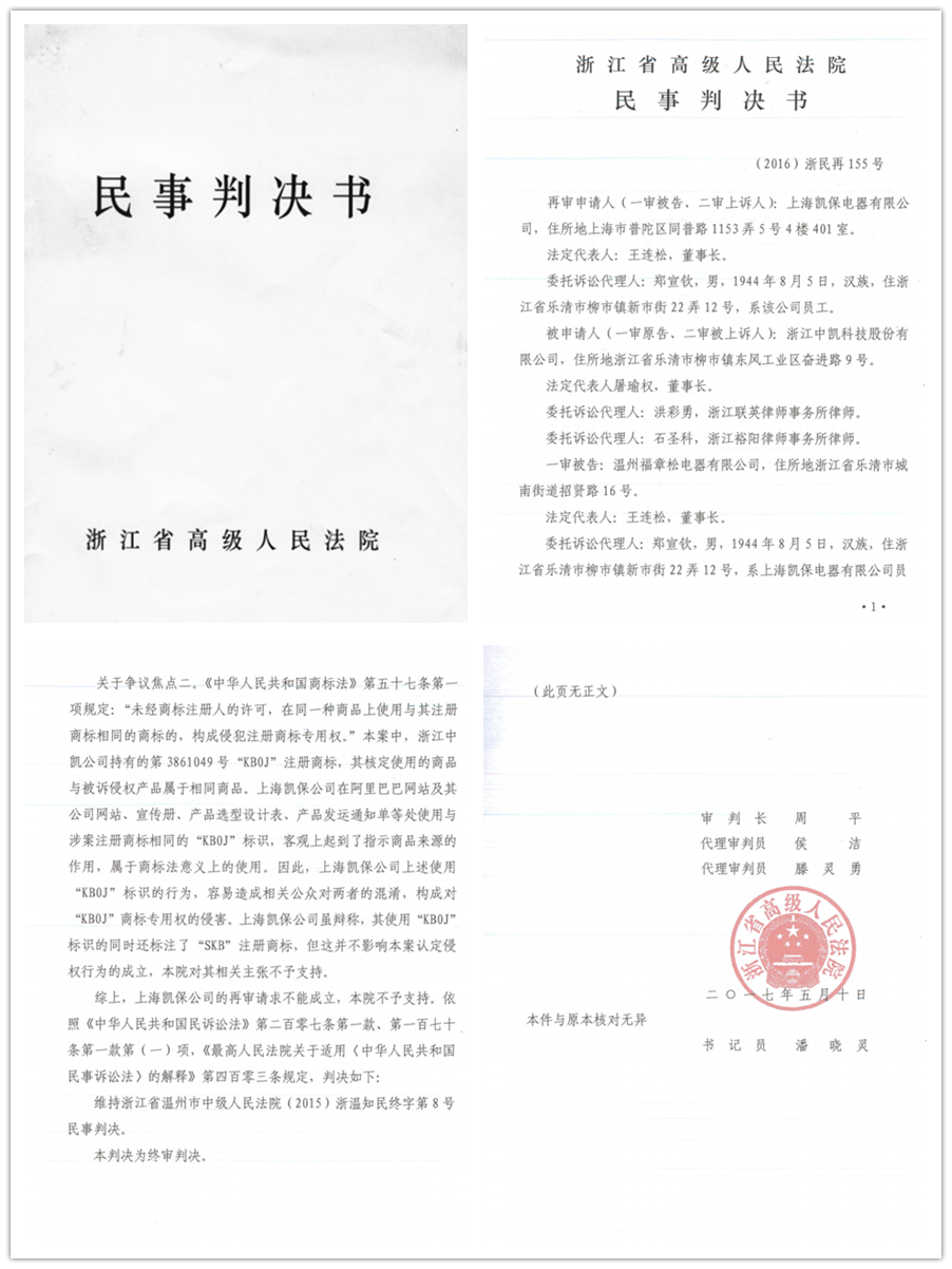 2017年5月10日,浙江省高級(jí)人民法院作出終審判決,中凱一場歷時(shí)三年的商標(biāo)維權(quán)案終于塵埃落定。本案得從2014年3月說起,因上海凱保長期蓄意侵害中凱商標(biāo)權(quán),在產(chǎn)品包裝盒、產(chǎn)品標(biāo)牌、企業(yè)官網(wǎng)、產(chǎn)品樣本、廣告等媒介平臺(tái)上大量使用與中凱KB0、KB0J、KB0D等商標(biāo)相似或近似字樣,并有意作一些誤導(dǎo)消費(fèi)者的宣傳,被中凱訴至法院。樂清市法院受理此案后,通過大量的調(diào)查了解,以大量的事實(shí)證據(jù)為依據(jù),認(rèn)定上海凱保侵權(quán)事實(shí)成立,判令上海凱保停止侵權(quán),賠償損失。上海凱保不服,上訴到溫州市中院,溫州市中院通過對(duì)案件的審查,最終在充分的事實(shí)和證據(jù)基礎(chǔ)上作出了維持一審判決的二審判決。上海凱保為達(dá)到其不可告人的目的,使出一套“纏”和“拖”的絕技,對(duì)二審法院的判決仍然表示不服,向浙江省高院提出再審申請(qǐng)。省高院受理案件后,開庭再審該案,在大量的事實(shí)和證據(jù)面前,最終作出了維持溫州市中院二審判決的終審判決。這一判決,標(biāo)志著一些別有用心,惡意侵害或蓄意侵占中凱商標(biāo)權(quán)的不法行為的破滅。