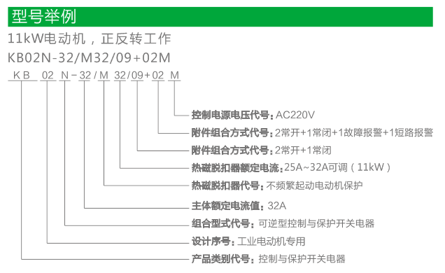 由兩臺KB02基本型產品主體,通過增加切換機械聯鎖、電氣聯鎖、相序切換銅排、輔助模塊等附件組成,構成了可逆電動機控制與保護開關電器。可逆型開關電器,主要通過外部控制回路,實現電源至電動機的相序改變,從而實現電動機的正、反轉控制。